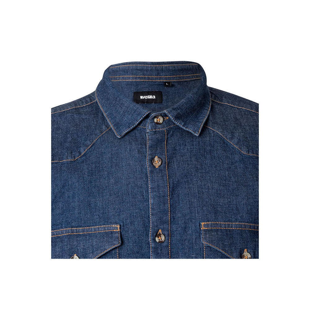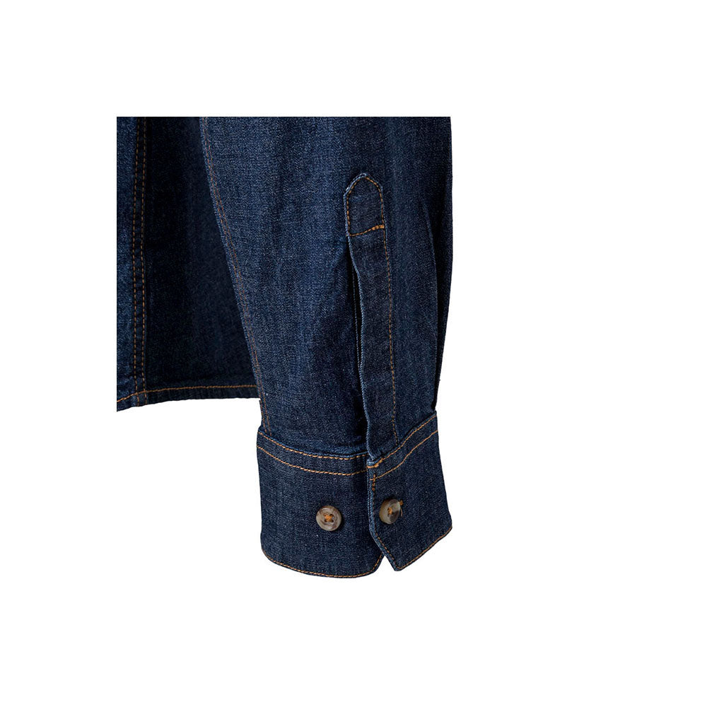 A afirmação de um estilo urbano e profissional para o homem moderno. A camisa Haora é a escolha definitiva para estabelecimentos que pretendem projetar uma imagem contemporânea, robusta e cheia de personalidade. Fabricada em Denim Stretch de 180 g/m², esta peça de manga comprida une a estética icónica do ganga à flexibilidade necessária para o serviço de Sala e Hotelaria.