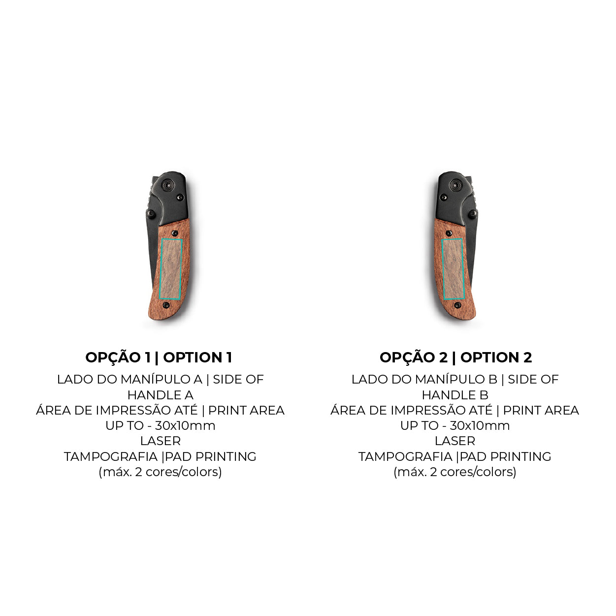 O canivete possui uma lâmina robusta em aço inoxidável com um distintivo acabamento em preto, o que lhe confere um aspeto tático e maior resistência à corrosão. O punho é fabricado em madeira natural, proporcionando uma pega confortável, um design orgânico e um toque de sofisticação.