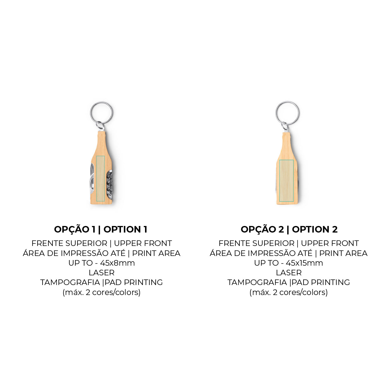 O porta-chaves integra uma multiferramenta com corpo em bambu, um material natural e renovável, conferindo-lhe um aspeto premium e ecológico. Os acessórios são fabricados em aço resistente, garantindo durabilidade e um desempenho fiável.