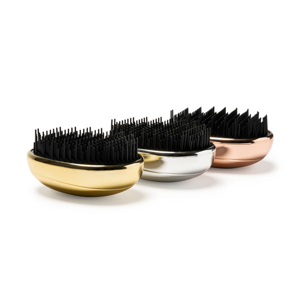 O seu design é prático e ergonómico, adaptando-se confortavelmente à mão. O acabamento brilhante confere-lhe um aspeto moderno e apelativo. As suas cerdas, especificamente desenhadas, trabalham em conjunto para desfazer os emaranhados suavemente.