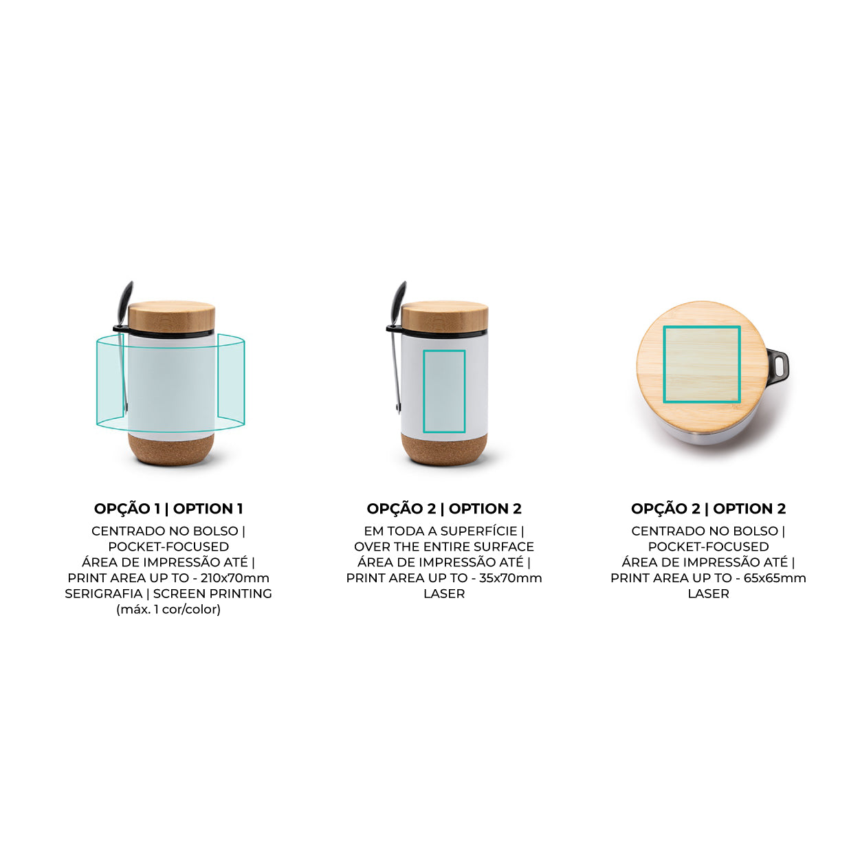 Desfrute das suas refeições favoritas em qualquer lugar, mantendo a temperatura e o sabor originais com a Garrafa Térmica Béchar. Este recipiente multifunções, com 400 ml de capacidade, foi projetado especificamente para o transporte de alimentos (sopas, papas, iogurtes ou refeições sólidas). Fabricada em aço inoxidável de alta qualidade, garante a máxima higiene e durabilidade, enquanto a combinação de bambu e cortiça confere um toque natural e sofisticado.