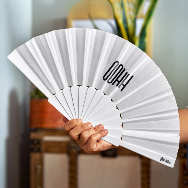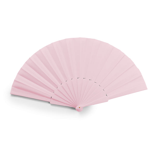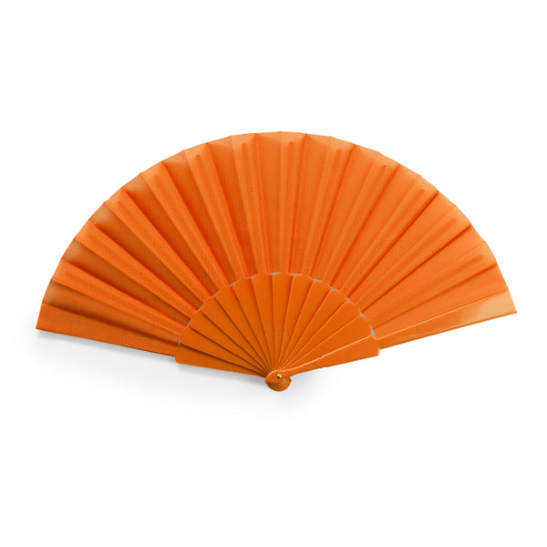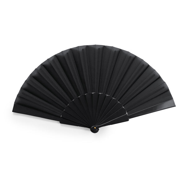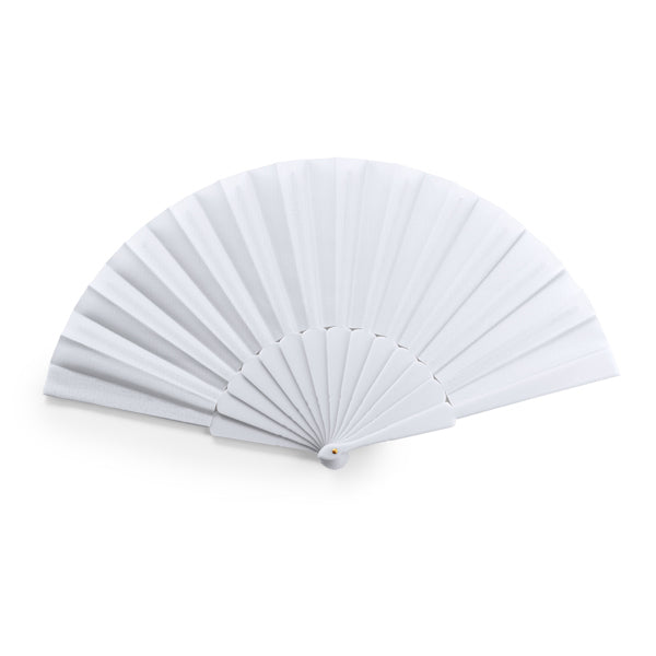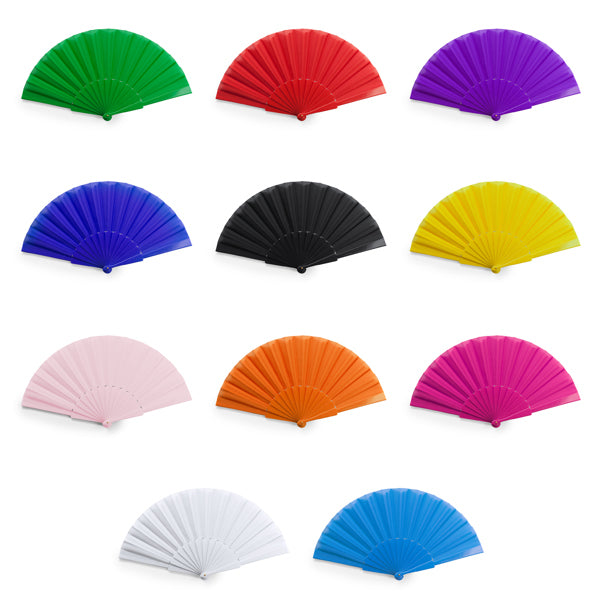 O leque é construído com varas em plástico durável, oferecendo leveza e um manuseamento fácil. O tecido é em poliéster, que proporciona uma superfície ideal para a ventilação e potencial personalização com designs ou logótipos.