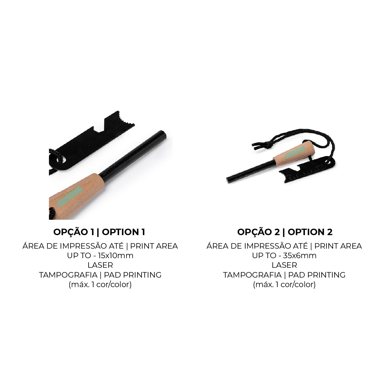 Esta peça notável integra uma função de isqueiro, tornando-a um acessório valioso para entusiastas do outdoor, campismo ou para situações de emergência. A ferramenta possui um corpo robusto, realçado pela sua pega em bambu, um material natural e renovável que lhe confere um aspeto eco-friendly e premium.