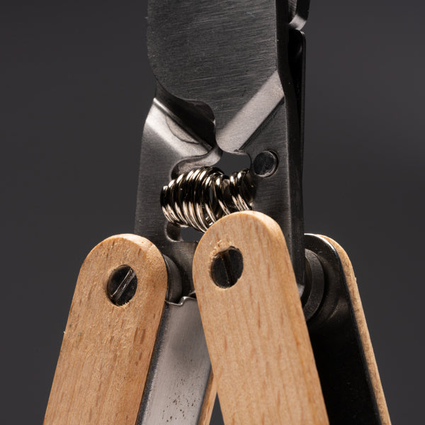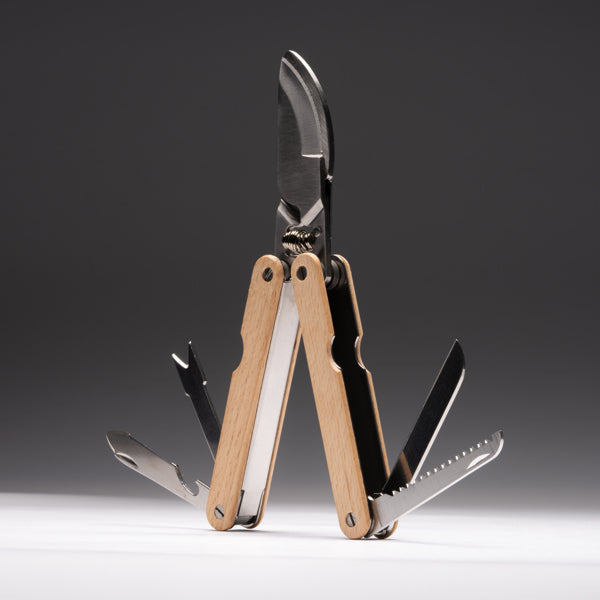 Esta peça é construída com acessórios e corpo em aço inoxidável para máxima longevidade e resistência ao uso. O seu cabo de madeira proporciona uma estética tradicional e um manuseamento ergonómico. A ferramenta concentra 6 funções cruciais para diversas aplicações: