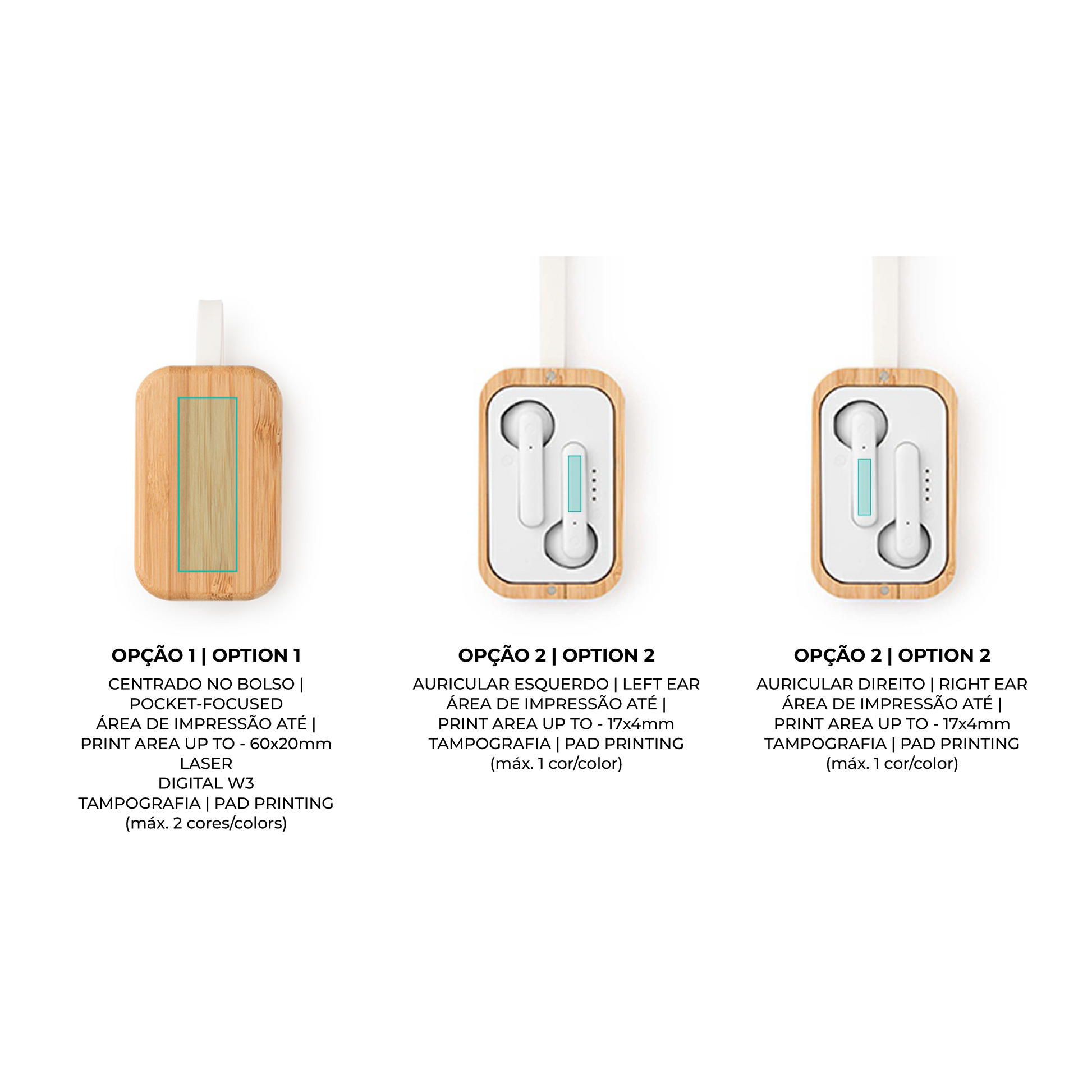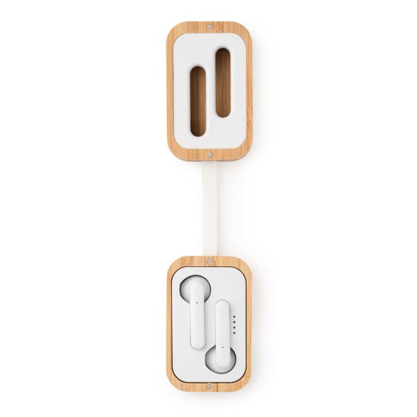 - Estojo de Carregamento em Bambu: Uma bateria externa de 400 mAh integrada numa estrutura de madeira natural, capaz de carregar os auriculares várias vezes.