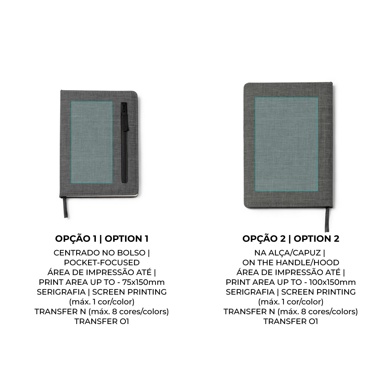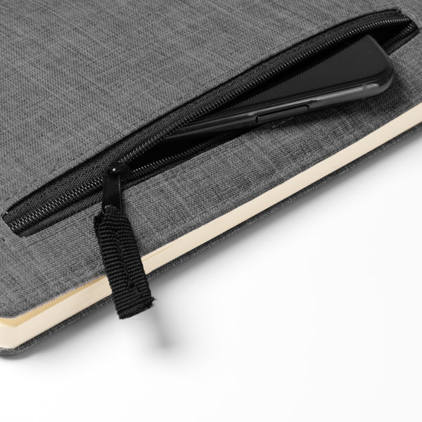 O seu diferencial é o bolso exterior com fecho de correr, ideal para guardar pequenos objetos de valor, pendrives, cartões ou esferográficas, transformando o caderno num mini-organizador portátil.