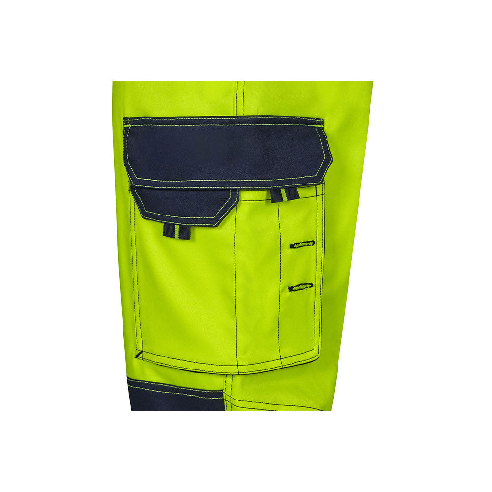 Segurança de Classe 2 e Proteção Articular. Equipada com a tecnologia de Fita Segmentada Reflatex RS, esta calça garante visibilidade certificada EN ISO 20471 Classe 2. As faixas termoadesivas segmentadas evitam a rigidez das fitas tradicionais, permitindo que o tecido estique totalmente. O seu grande diferencial é o compartimento para joelheiras com acesso inferior e fecho de velcro, protegido por pinças no joelho que pré-formam a peça para uma ergonomia perfeita.