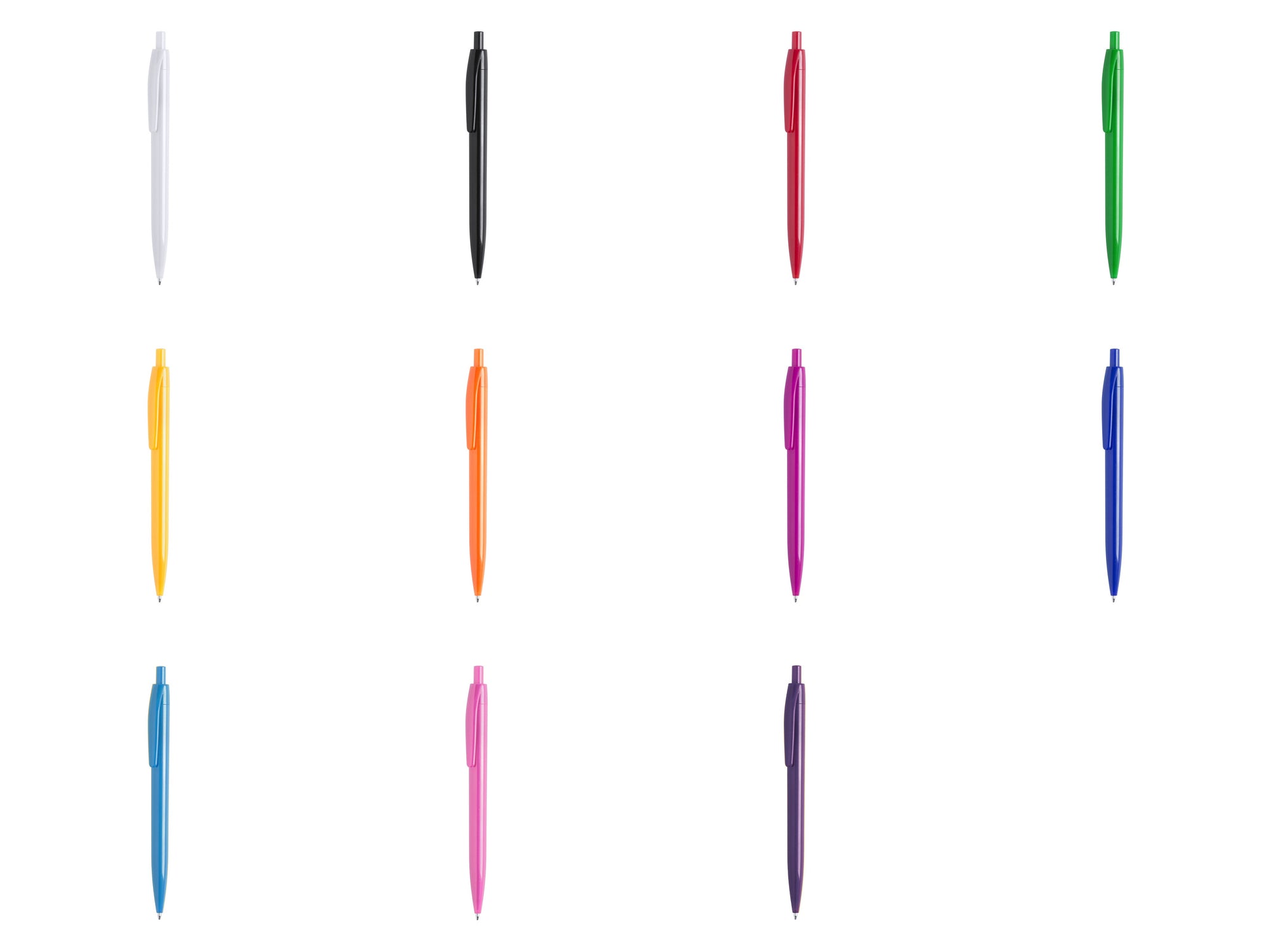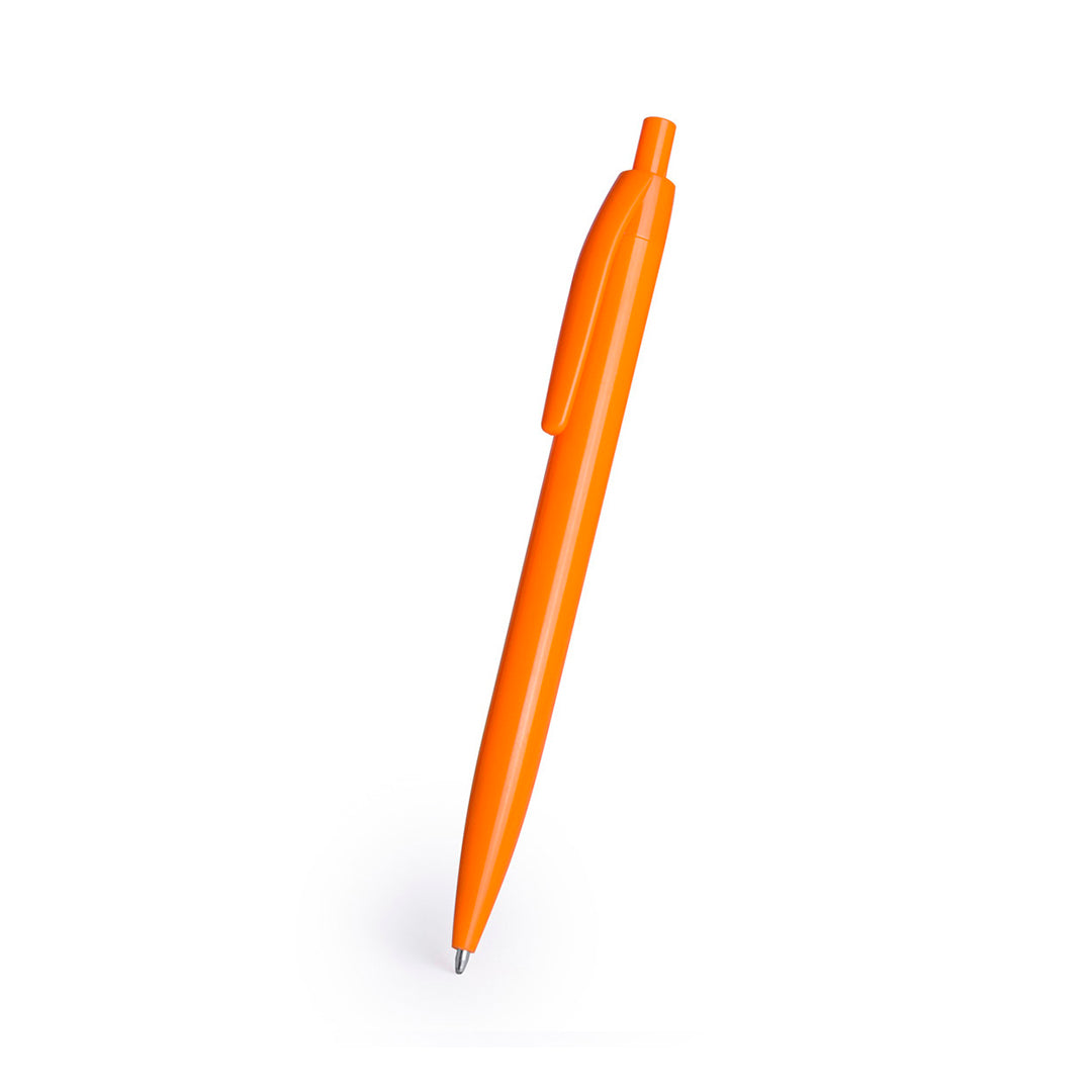 Caneta de mecanismo pulsador, de design monocromático em várias de cores vivas e brilhantes. Tinta azul.