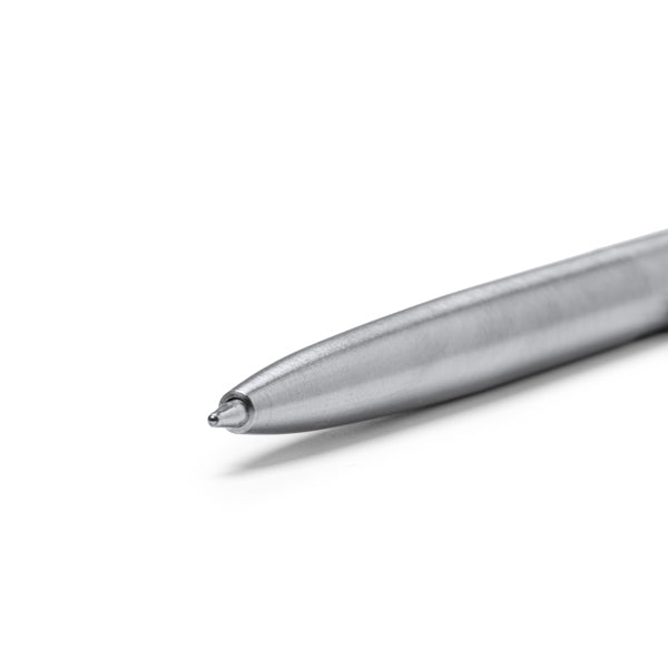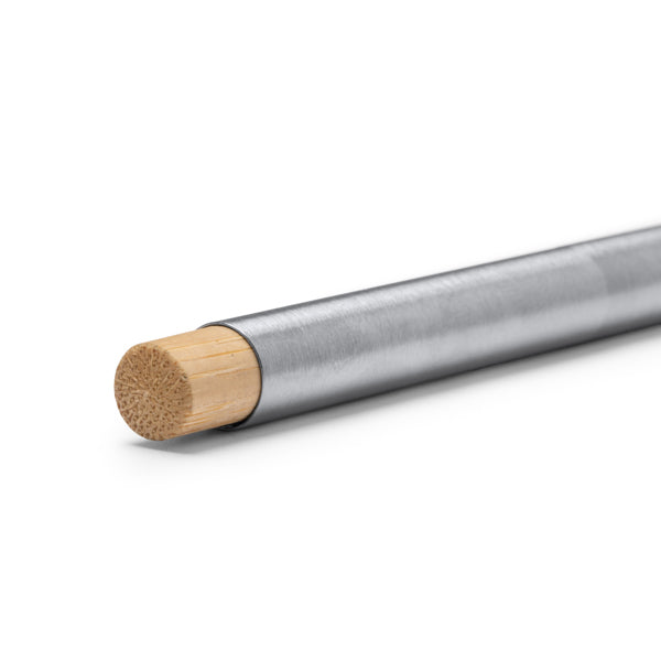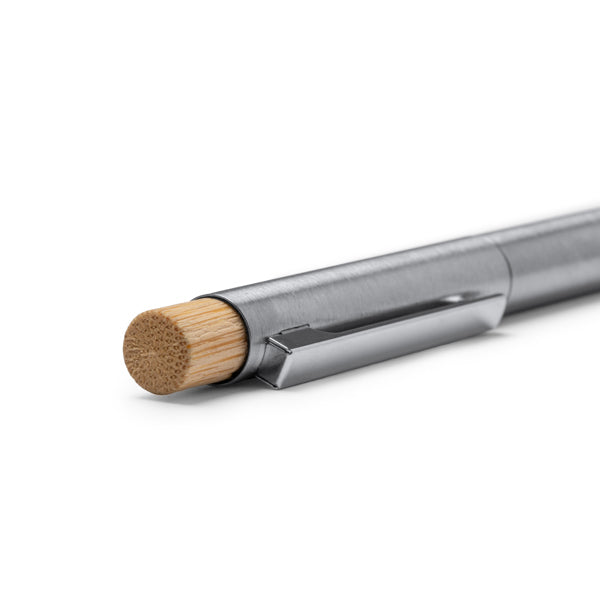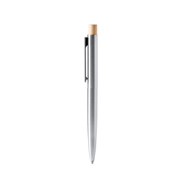 Com um corpo elegante em aço inoxidável reciclado e um botão de pressão em bambu, esta esferográfica é uma escolha consciente para o seu dia a dia. O seu enchimento de tinta azul jumbo garante uma escrita fluida, suave e de longa duração, ideal para todas as suas notas e assinaturas.