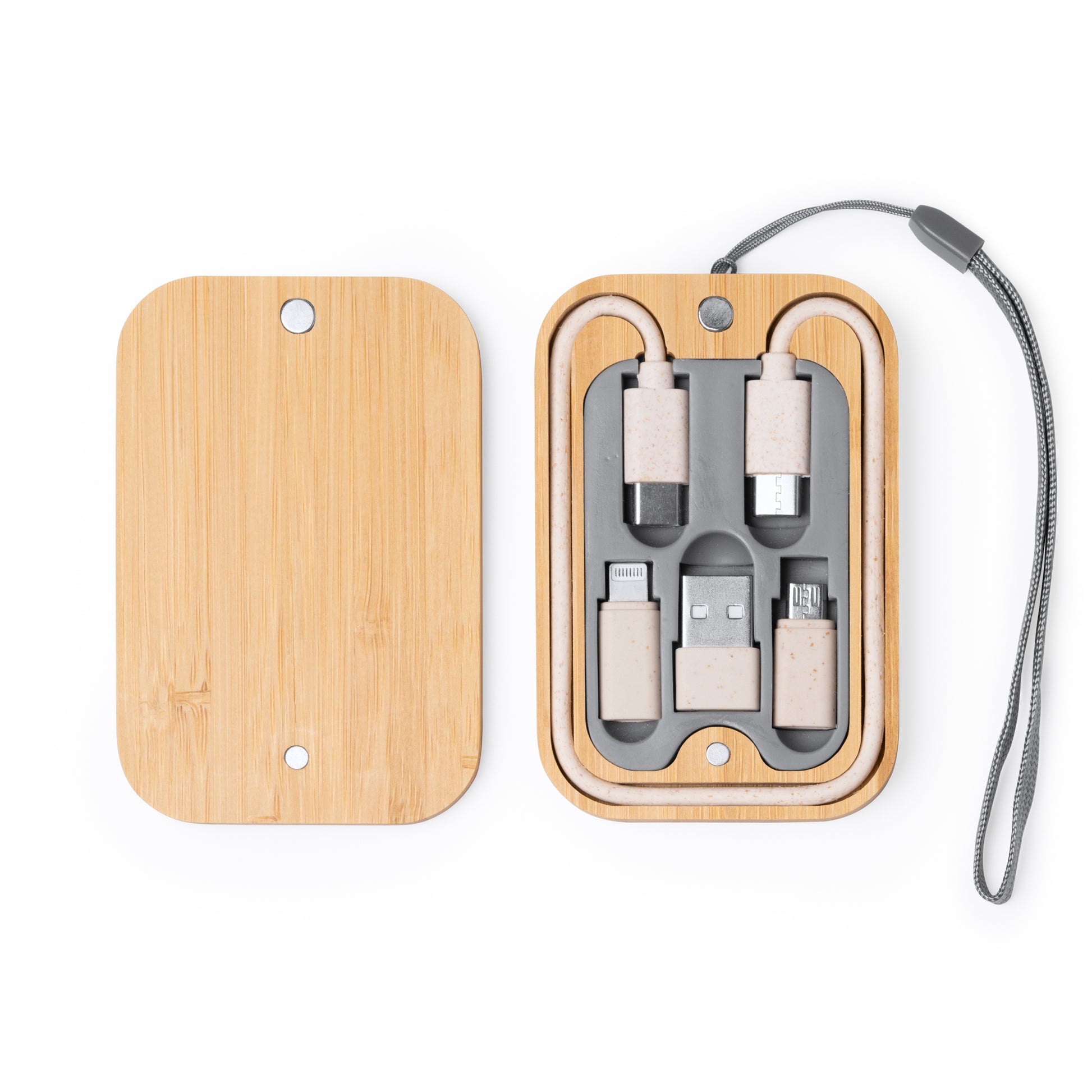 Este kit, apresentado numa elegante e prática caixa de bambu com tampa magnetizada, inclui os cabos essenciais: Micro USB, Tipo-C e Lightning. Seja para carregar o seu smartphone, tablet ou outro dispositivo, a compatibilidade está garantida.