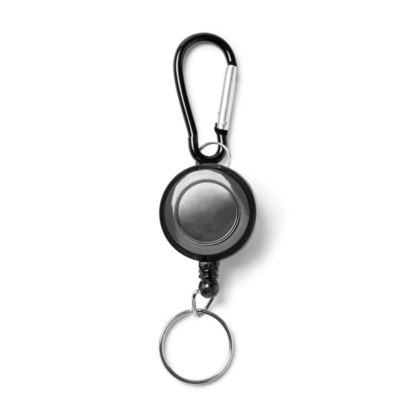 - Um anel retrátil com um cabo de enrolar automático, que permite estender chaves ou crachás a uma distância confortável sem ter de desencaixar o chaveiro.