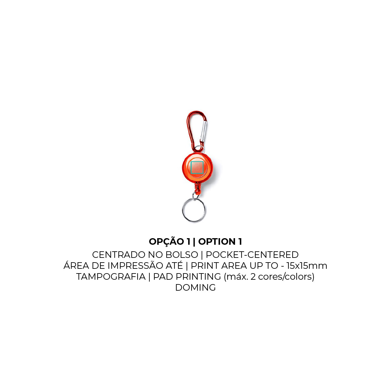 - Um mosquetão robusto, que permite prender o chaveiro a cintos, malas ou alças.