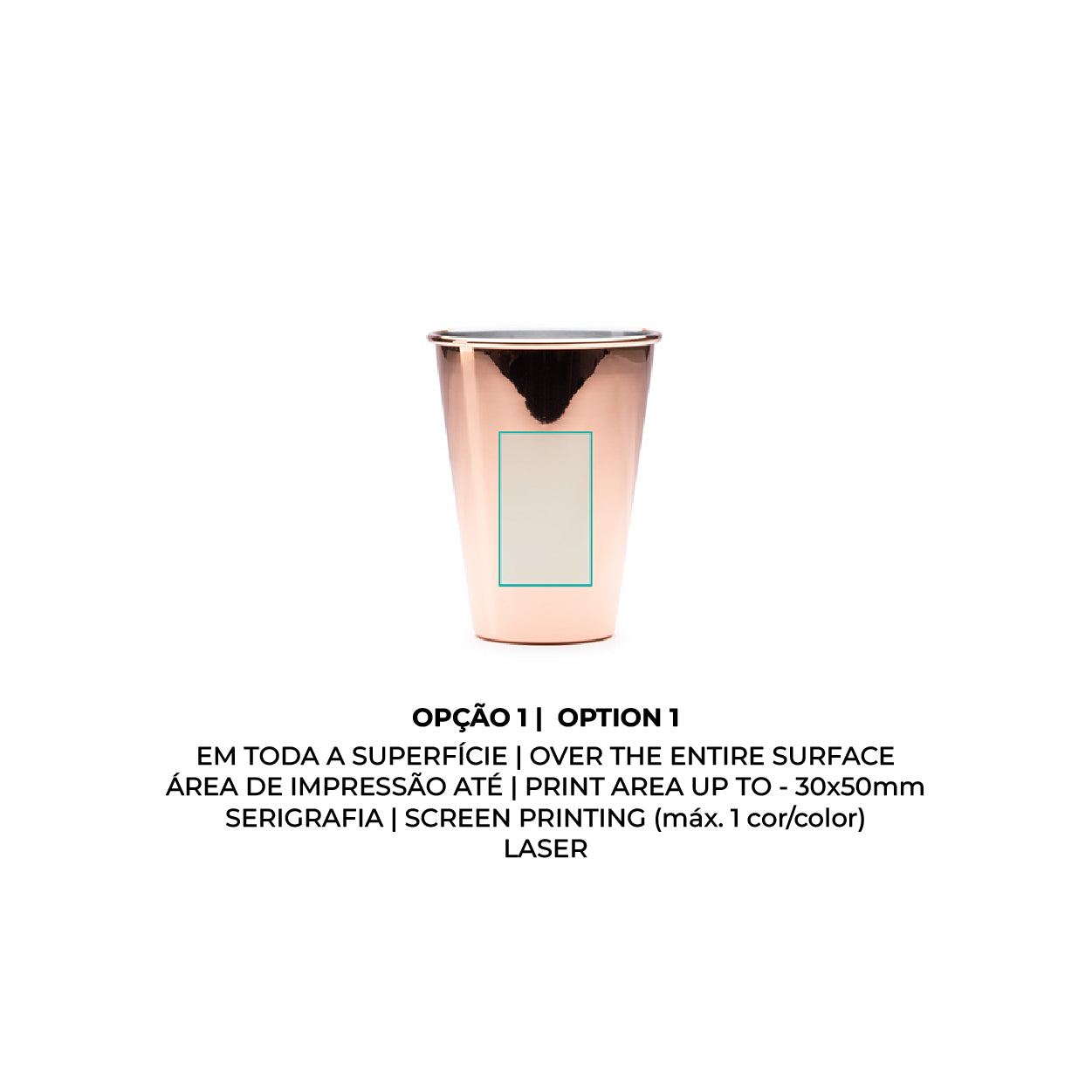 Esta chávena é fabricada em aço inoxidável, garantindo longevidade e resistência para o uso em todas as atividades diárias. O elemento mais atraente é o revestimento exterior de cobre, que confere um toque distinto e atraente, elevando o visual da peça.