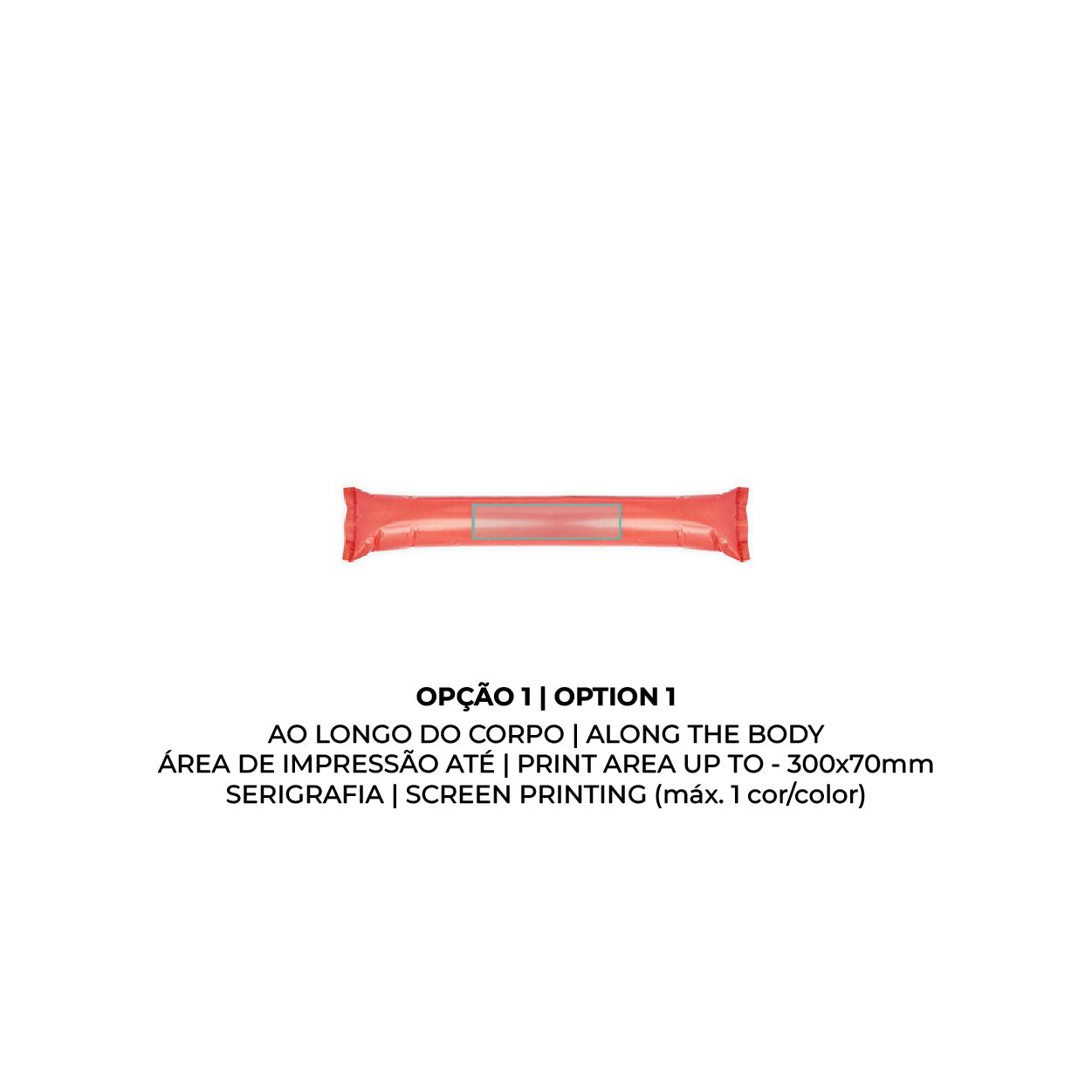 Este conjunto inclui dois bastões, fabricados em LDPE (Polietileno de Baixa Densidade), um material que os torna resistentes e reutilizáveis para diversas ocasiões. A sua principal função é o efeito sonoro: quando batidos um contra o outro, produzem um som alto e contínuo. A válvula de insuflação incluída permite enchê-los de forma rápida e eficiente.
