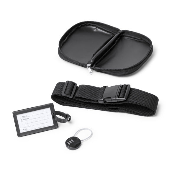 Tudo o que precisa num estojo eco-friendly. Apresentado num estojo em RPET (plástico reciclado) com abertura total, este kit mantém as suas ferramentas de viagem organizadas e prontas a usar. O conjunto inclui uma alça de bagagem robusta e ajustável, um cadeado com combinação para evitar chaves perdidas e um cartão de identificação durável. É a solução perfeita para quem procura tranquilidade e eficiência em cada destino.