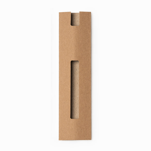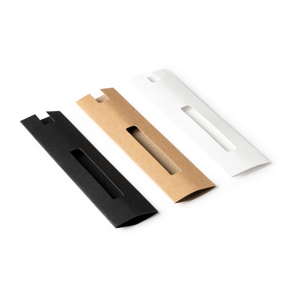 Feita em cartão resistente, esta embalagem para canetas tem um design minimalista e uma abertura frontal que permite expor a caneta com facilidade e sofisticação. É a embalagem ideal para um brinde de sucesso.