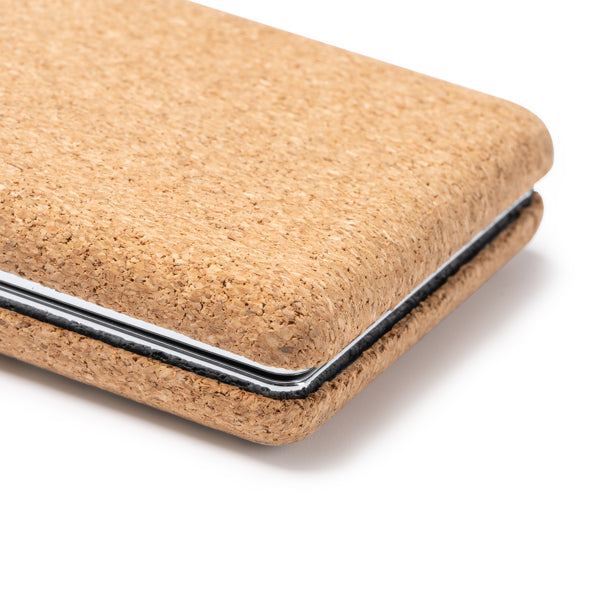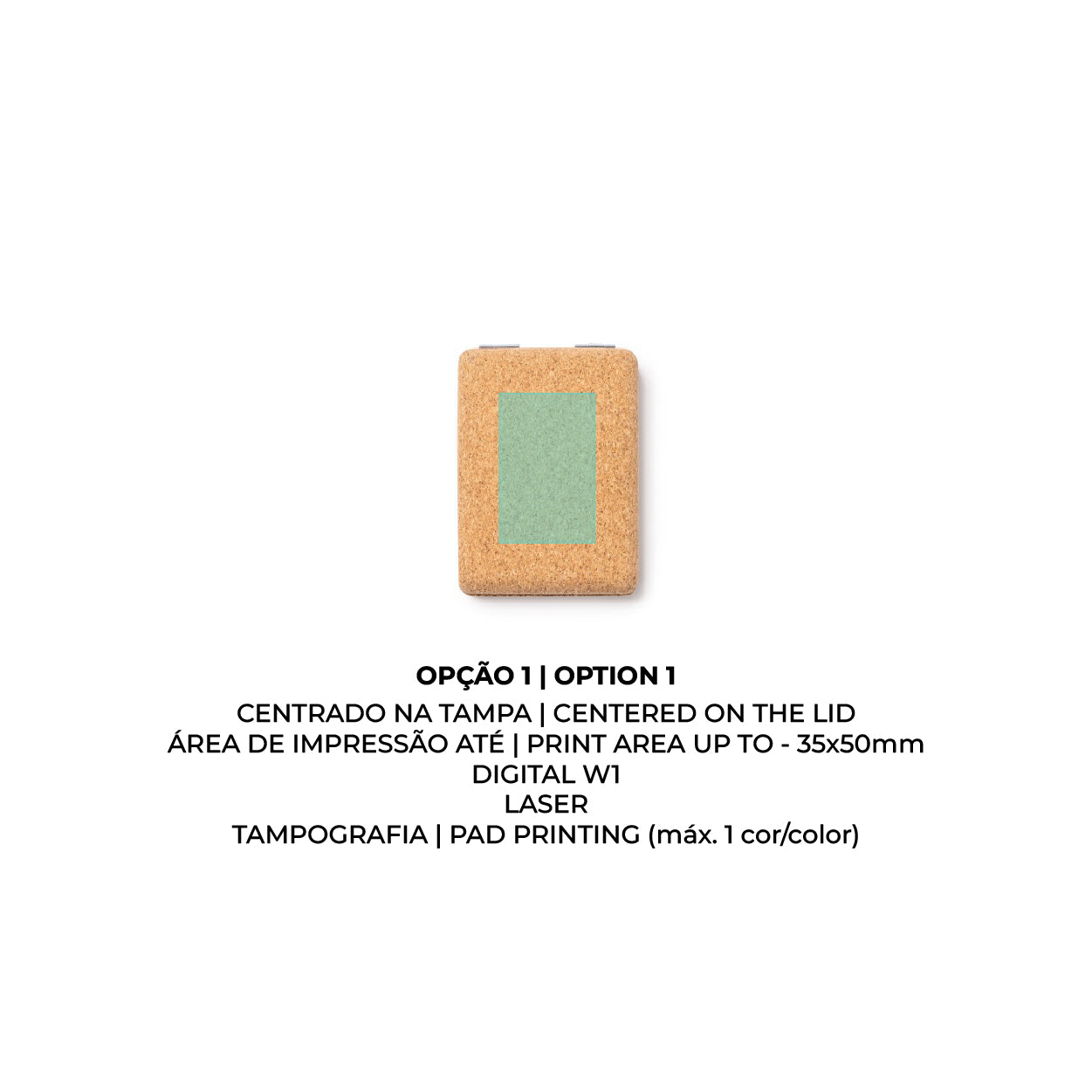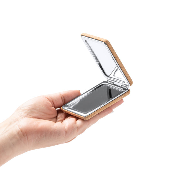 O espelho apresenta um design quadrado e compacto, ideal para ser transportado em qualquer mala ou bolso. É fabricado com uma combinação de cortiça natural, um material sustentável que confere um toque agradável, e acabamentos em metal cromado, que garantem durabilidade e sofisticação.