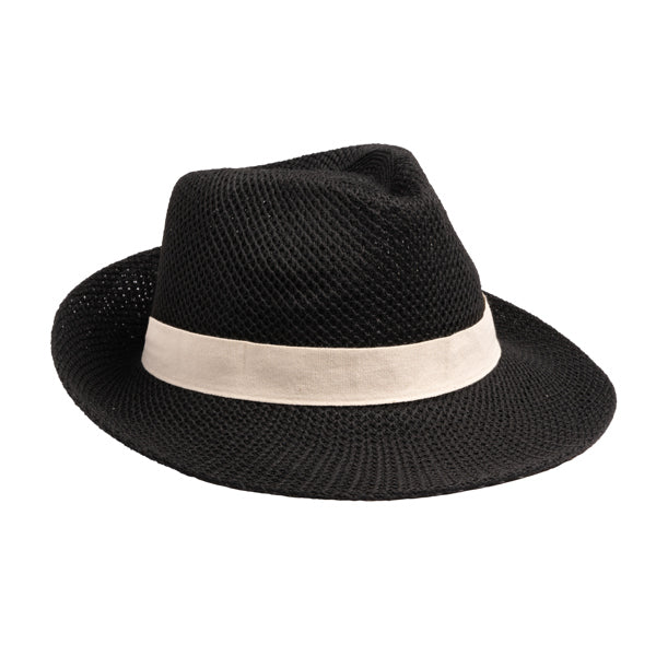 A fita é fabricada em algodão, um material que proporciona uma textura suave, um aspeto orgânico e é confortável ao toque. A sua composição natural torna-a uma excelente base para personalização, seja através de impressão ou bordado, integrando-se elegantemente no chapéu.