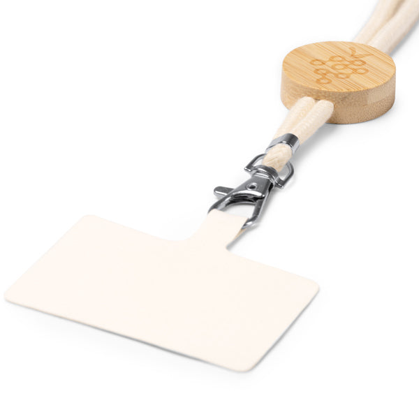O lanyard é feito em algodão, proporcionando uma sensação suave e confortável ao toque. O design incorpora um pormenor em bambu, que adiciona um toque natural e premium. Além disso, inclui um sistema de ajuste prático, permitindo personalizar o comprimento para um encaixe perfeito.