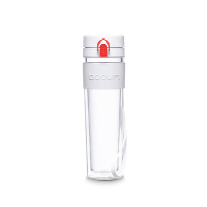Garrafa transparente com parede dupla em Tritan™ de alta qualidade. A parede dupla de isolamento (sem BPA) é resistente a quebras e não mancha ou deixa sabor. Contém faixa em silicone para um transporte confortável e seguro. Possui também uma tampa de enroscar com abertura fácil no topo que garante uma boa fluidez de água, previnindo acidentes. A garrafa é fácil de transportar e o fecho inovador acautela derrames na sua mochila. É a companhia ideal para o seu quotidiano. Adequado para máquina de lavar louça. Tem capacidade até 450 mL.