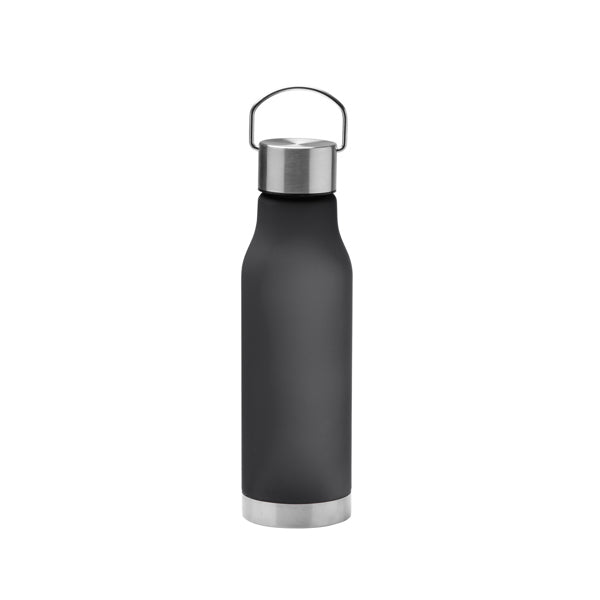 O corpo da garrafa é fabricado em RPET (poliéster reciclado), uma escolha ecológica que confere um acabamento fosco translúcido. Esta sustentabilidade é combinada com elementos robustos em aço inoxidável no fundo, na tampa e na pega, garantindo longevidade e um visual premium. Possui uma capacidade prática de 600ml.