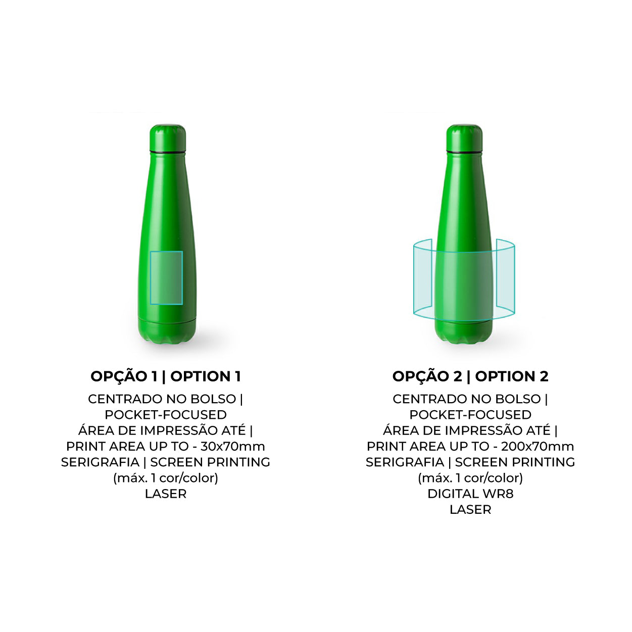 Construída em aço inoxidável, esta garrafa garante um produto durável, seguro para alimentos e altamente resistente. O seu design apresenta-se em várias cores sólidas, todas com um elegante acabamento fosco, uma característica que ajuda a "destacar os seus padrões" personalizados.