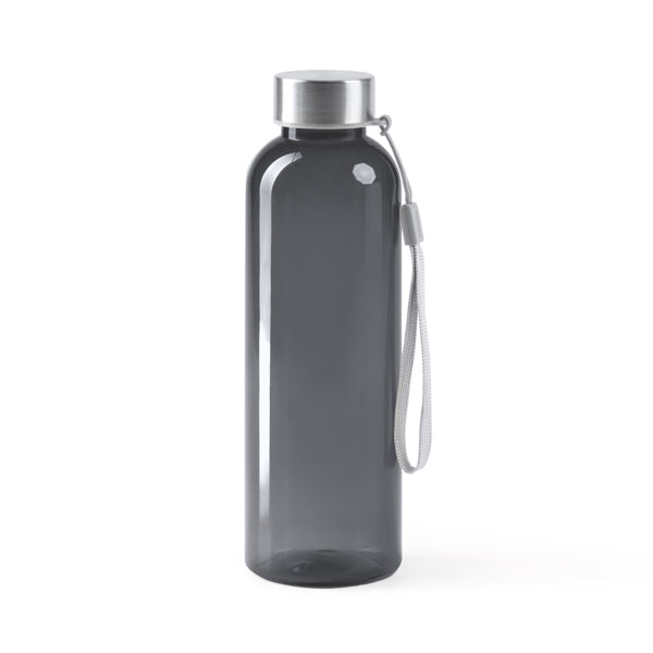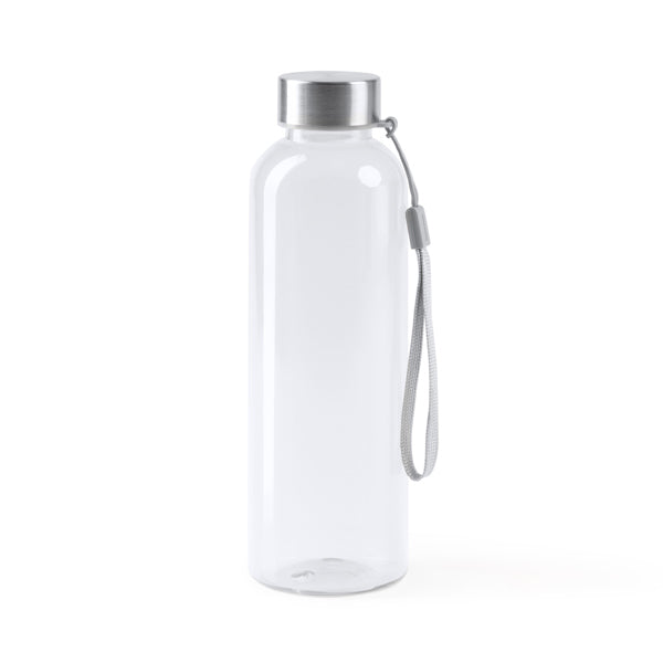 Fabricada em RPET (poliéster reciclado), esta garrafa possui um corpo de cor translúcida que lhe confere um visual contemporâneo. A sua capacidade de 600ml é prática para o uso diário, e a durabilidade é garantida pelos materiais, incluindo detalhes em aço inoxidável.