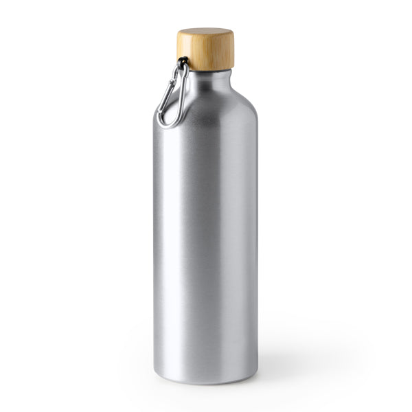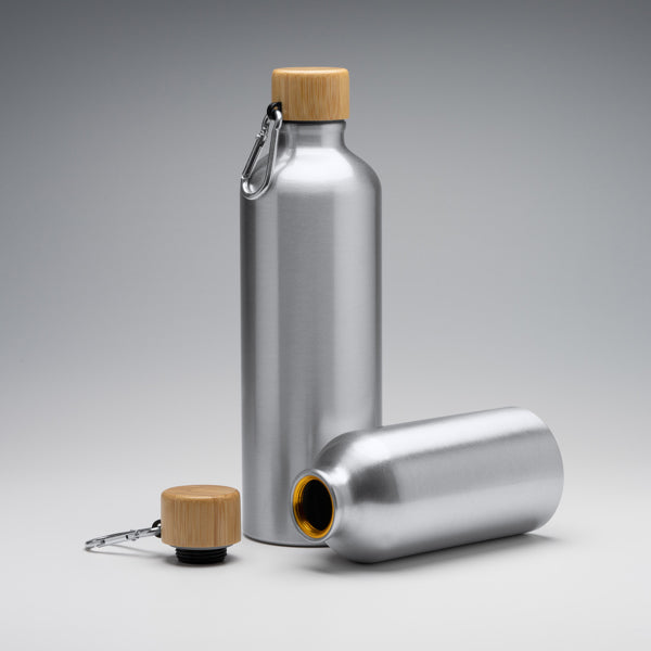 Esta garrafa distingue-se pela sua tampa de bambu, que confere um aspeto premium e orgânico, contrastando com o corpo em alumínio leve e durável. Possui uma capacidade generosa de $800\text{ ml}$, perfeita para o ginásio, caminhadas ou dias de trabalho.