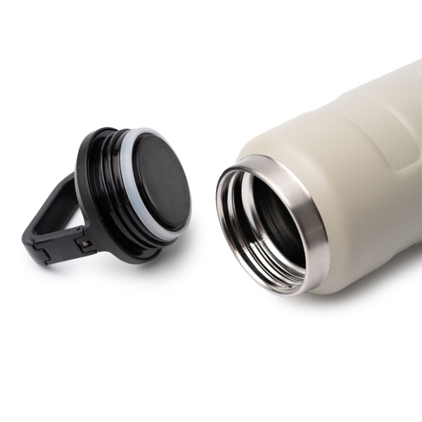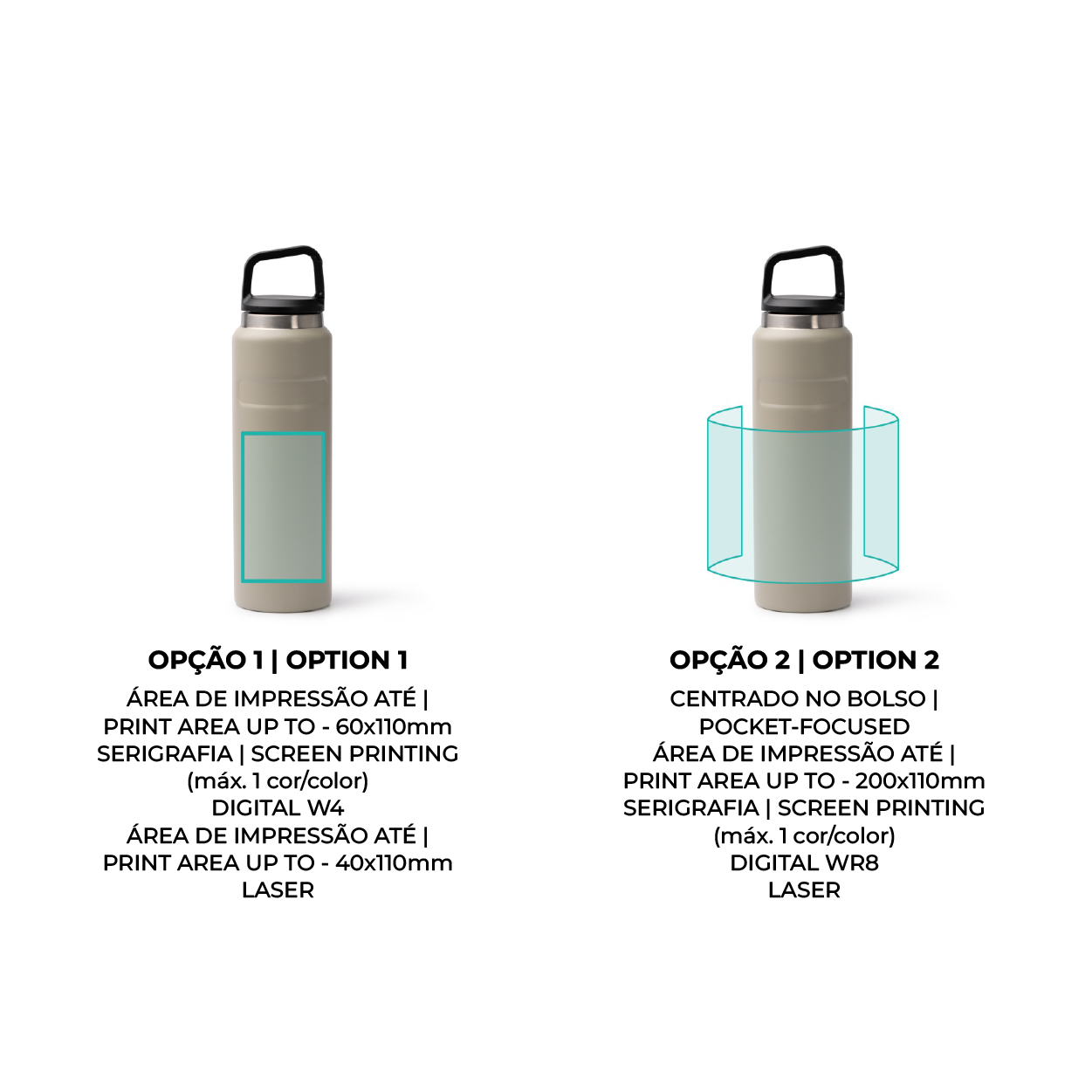 Esta garrafa é fabricada em aço inoxidável reciclado, uma escolha eco-friendly que assegura longevidade e resistência. A construção de parede dupla e o acabamento mate (revestimento em pó) garantem uma retenção térmica eficaz, mantendo o exterior confortável ao toque.