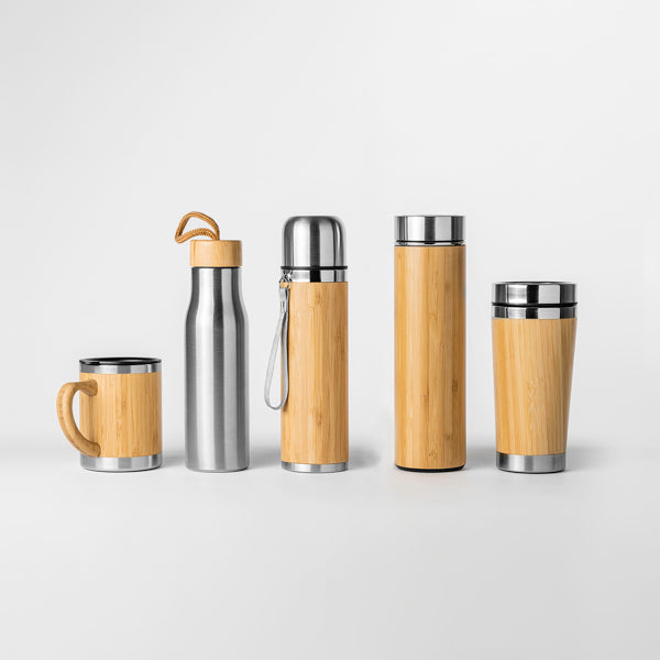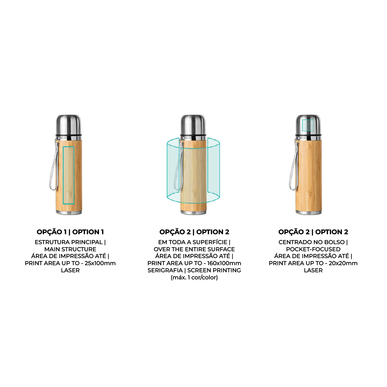Esta garrafa é fabricada em aço inoxidável, apresentando um revestimento duplo que assegura um isolamento térmico de excelência. A sua performance é impressionante, mantendo as bebidas quentes por 6 horas e frias por um extenso período de 15 horas. O corpo integra o bambu no seu design, conferindo-lhe uma estética clean e orgânica.