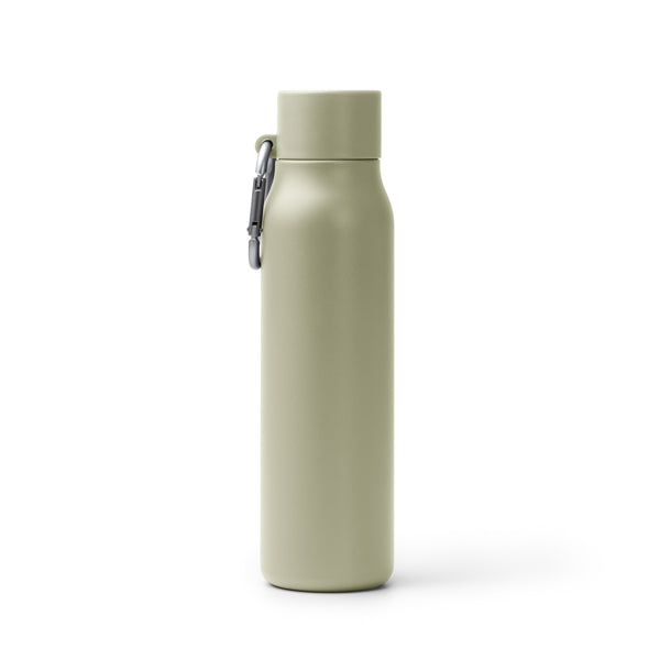 Esta garrafa é fabricada com aço inoxidável reciclado, uma escolha amiga do ambiente que não compromete a qualidade nem a durabilidade. A sua construção de parede dupla garante um excelente isolamento térmico e possui um elegante acabamento mate (revestimento em pó).