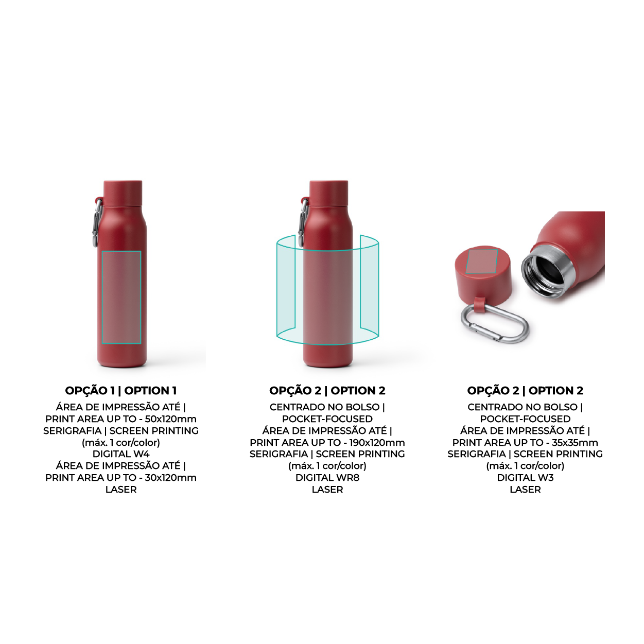 Devido à sua construção, a garrafa não é adequada para máquina de lavar loiça, sendo recomendada a lavagem à mão para manter a integridade do acabamento mate. As suas dimensões são de 25x6,5cm.