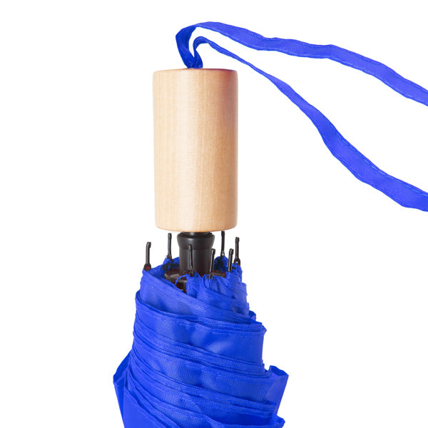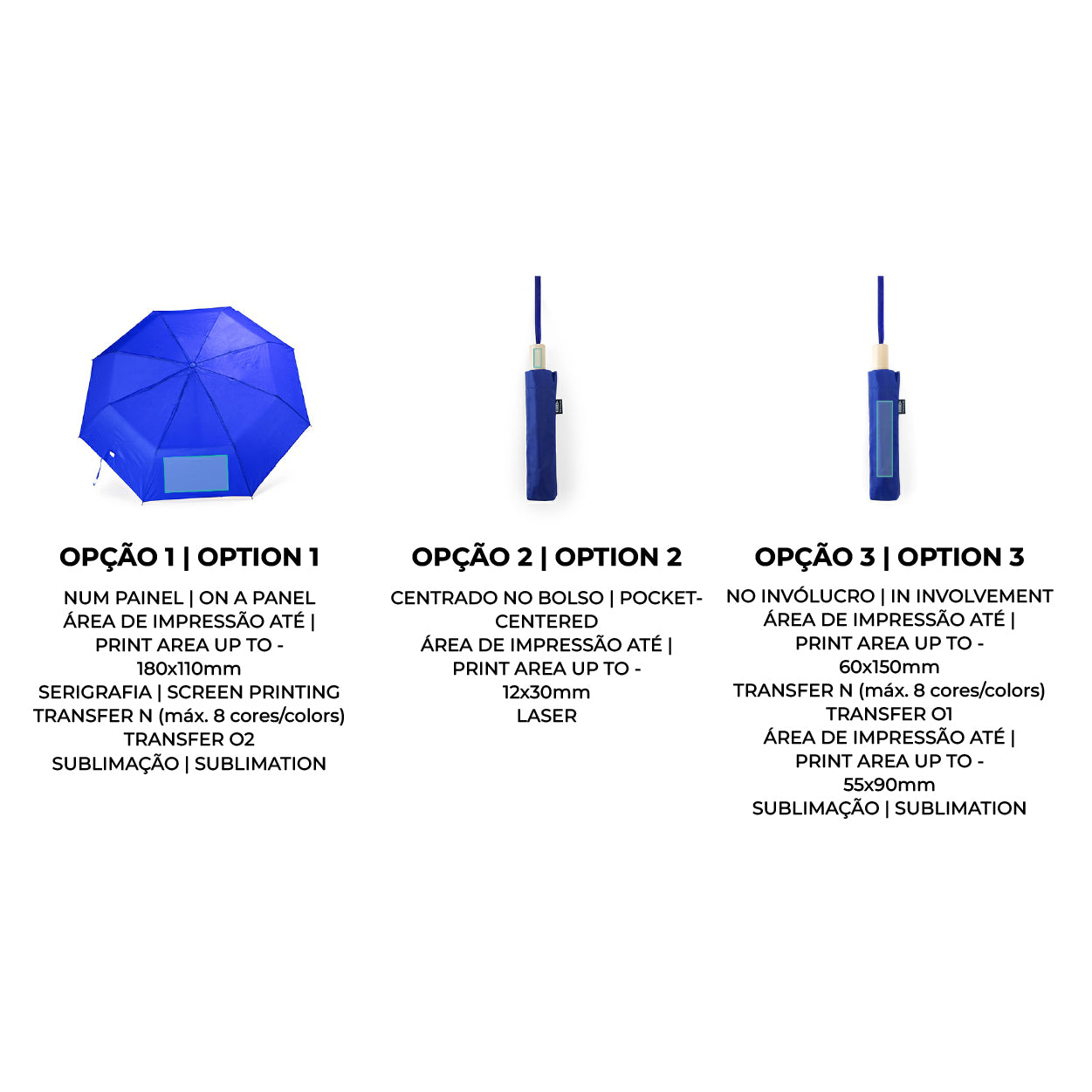 O tecido em RPET é feito de materiais reciclados, demonstrando o seu compromisso com o ambiente. A estrutura robusta, com haste, varetas e pontas em preto, é complementada pela elegância de um cabo de madeira natural.