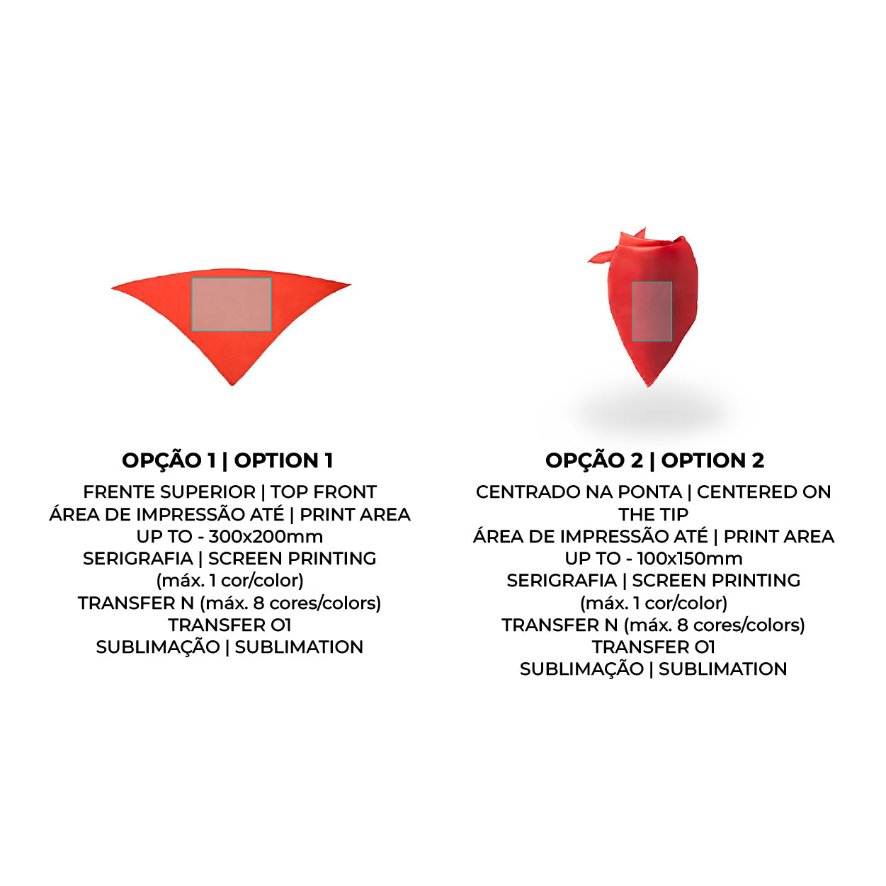 Confeccionado em tecido 100% poliéster, é fino e leve, com uma gramagem de apenas 60 g/m², garantindo um caimento suave e confortável. O seu formato triangular oferece versatilidade no uso, seja como lenço de pescoço, bandana ou detalhe na roupa.