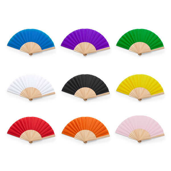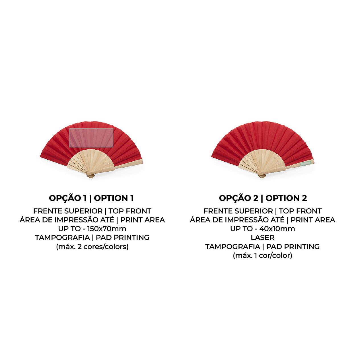 As nervuras são feitas em madeira, um material natural que garante a robustez e confere ao leque um aspeto sofisticado. O tecido é fabricado em PET reciclado, o que significa que utiliza plásticos reutilizados, sendo uma escolha consciente e amiga do ambiente.