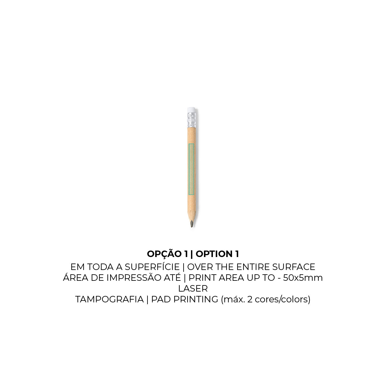 O mini-lápis é fabricado em madeira, um material clássico e sustentável. Possui um corpo redondo que oferece um manuseamento confortável. O acabamento é feito com uma borracha natural no topo (ou ponta), garantindo que os erros podem ser corrigidos facilmente. É fornecido com a ponta afiada, pronto a usar imediatamente.