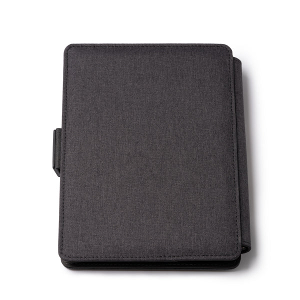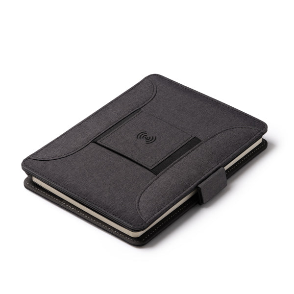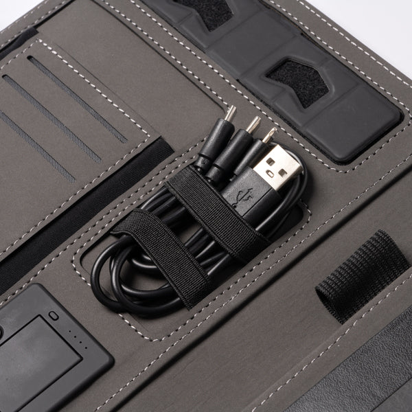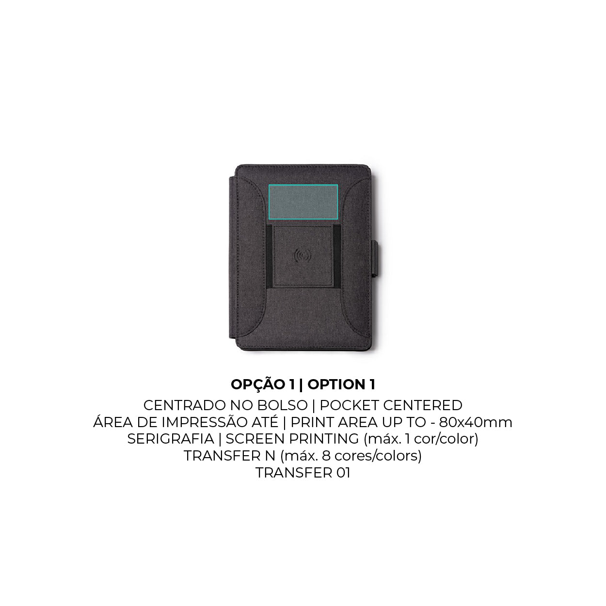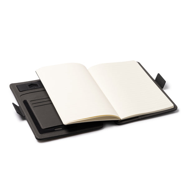 O seu design multifunções inclui um carregador sem fios integrado na tampa, permitindo-lhe carregar convenientemente o seu smartphone. O fecho magnético garante a segurança de todos os seus pertences, enquanto o interior inteligentemente organizado oferece um bloco de notas amovível, um suporte para o telemóvel e suportes para cartões e canetas.