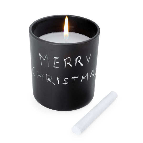 A vela branca é apresentada num recipiente redondo de cerâmica preta, que funciona como uma superfície de ardósia. O seu diferencial é o giz incluído, permitindo-lhe escrever mensagens, desenhar ou rotular o aroma diretamente no recipiente.
