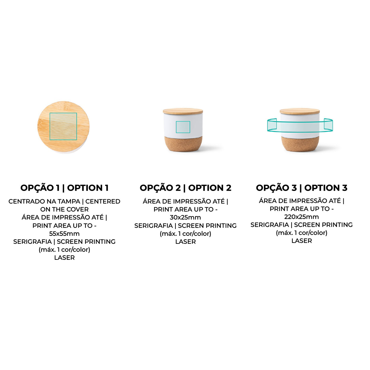 A vela é feita com cera vegetal, uma escolha ecológica que assegura uma queima limpa. É apresentada num recipiente de cerâmica com uma base de cortiça natural e uma tampa de bambu. Esta combinação de materiais confere-lhe um aspeto premium e orgânico.