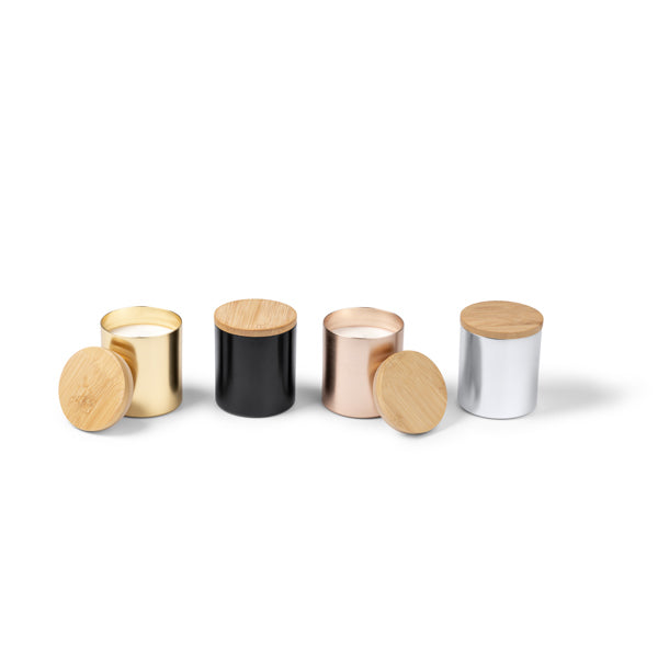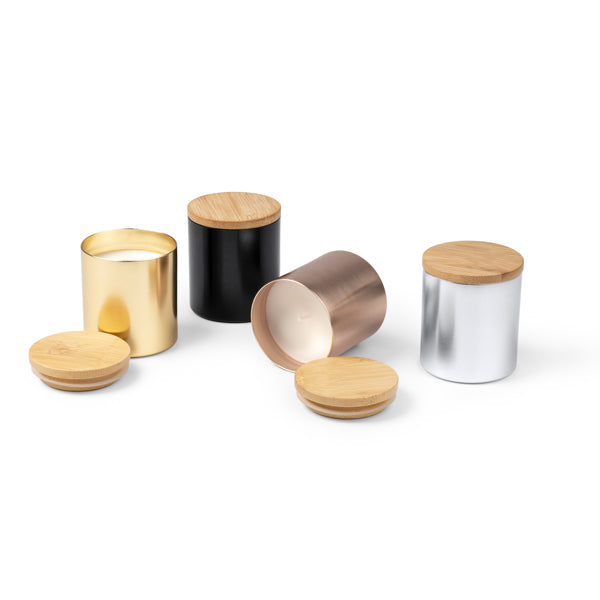 A vela é apresentada num elegante recipiente de alumínio com acabamento metálico, que garante durabilidade e um visual moderno. É rematada com uma tampa de bambu que, além de proteger a cera, confere um toque natural e premium ao conjunto.